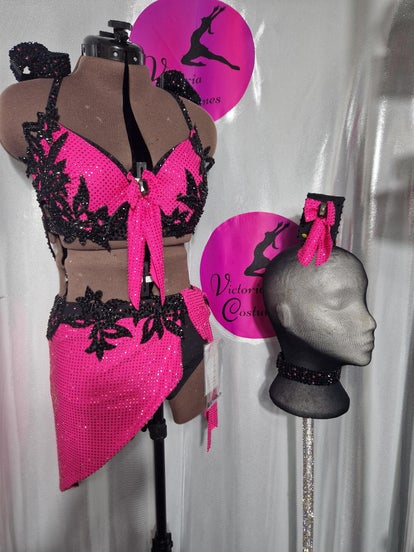 Two piece suit, black applique stones, pink stoned lined skirt and bra top.
