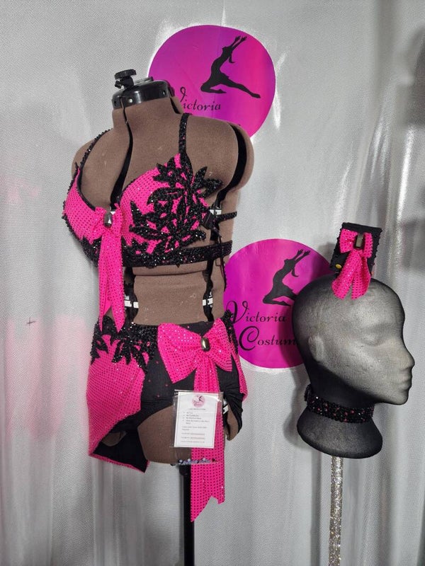 Two piece suit, black applique stones, pink stoned lined skirt and bra top.